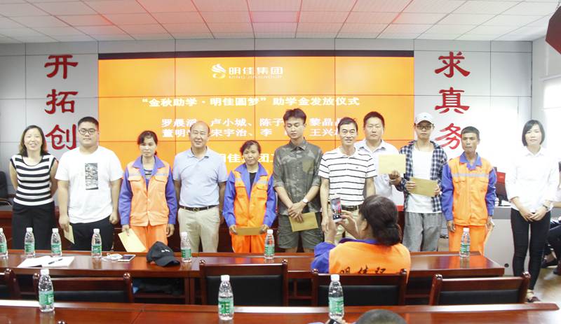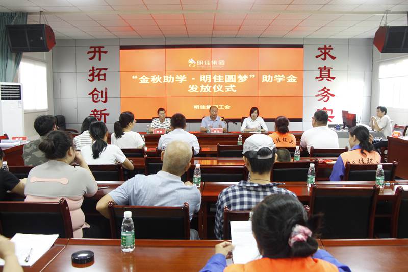 8月28日上午,明佳集團(tuán)工會“金秋助學(xué)·明佳圓夢”助學(xué)金發(fā)放儀式在集團(tuán)公司三樓會議室舉行,為8個考取大學(xué)的職工子女發(fā)放助學(xué)金共計9600元?偛藐愒、副總經(jīng)理鐘寒參加發(fā)放儀式,儀式由工會主席高斐斐主持。
