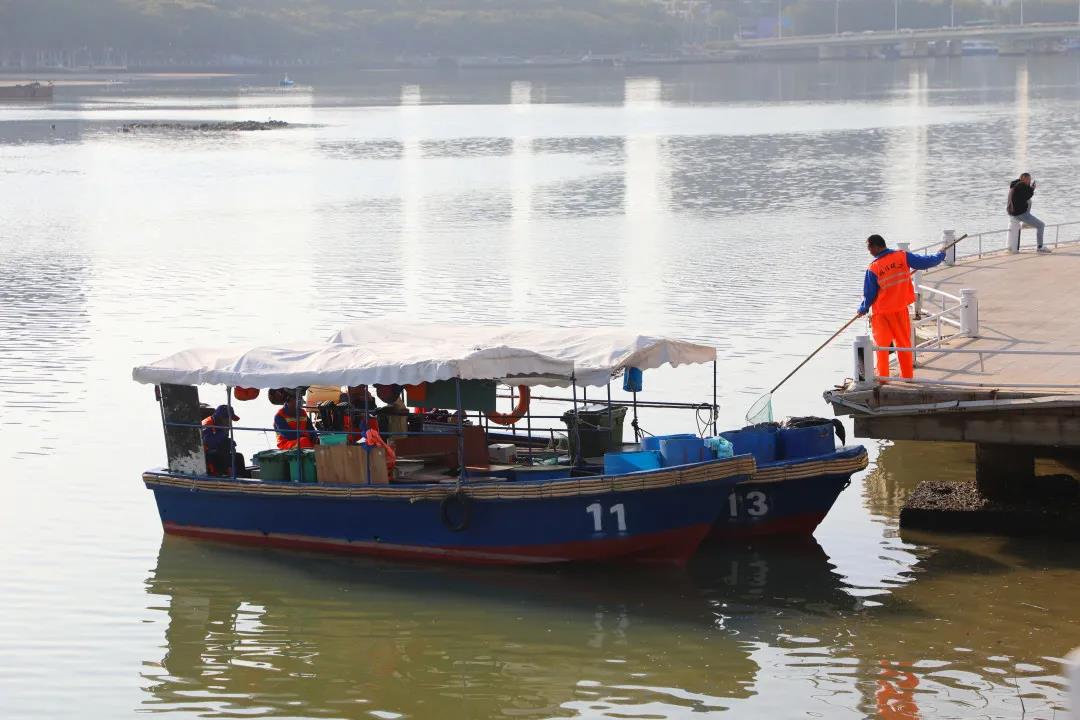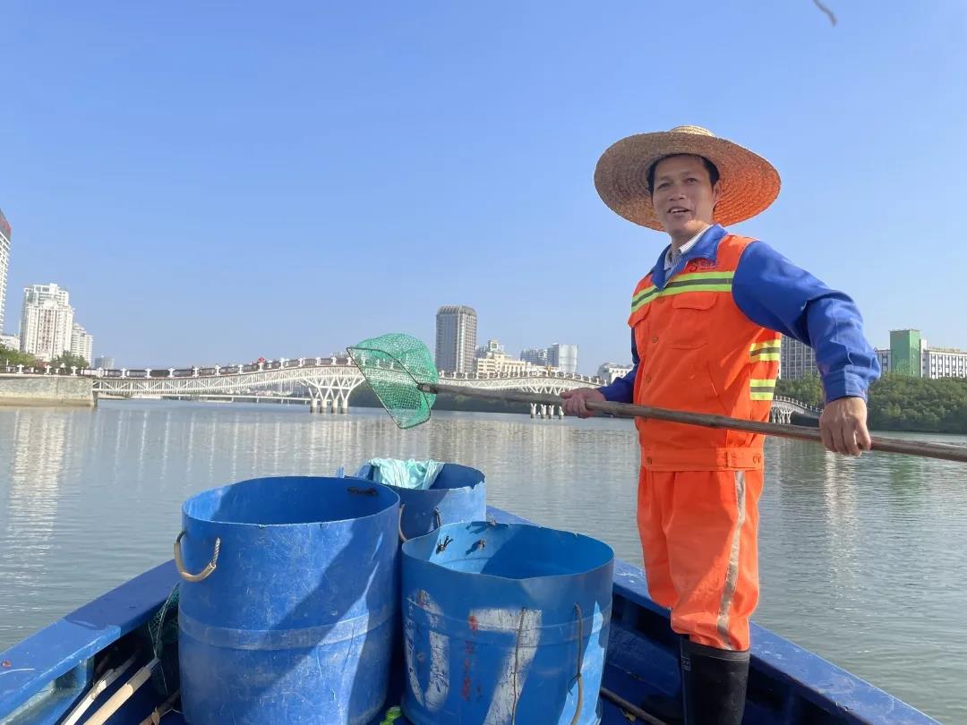 曾靈是三亞明佳園林環(huán)衛(wèi)集團天涯區(qū)環(huán)衛(wèi)二隊的一名員工,和我們平常在街邊看到清理地面垃圾的環(huán)衛(wèi)工人有所不同,他的工作是在船上完成的,每天需要站在作業(yè)船上,手持一把長柄濾網,將漂浮在三亞河上的落葉、紙屑等垃圾打撈起來,放入專門的垃圾桶里再運輸走。記者來到曾靈的工作地點:三亞河,近距離了解他春節(jié)期間的工作是什么樣的……